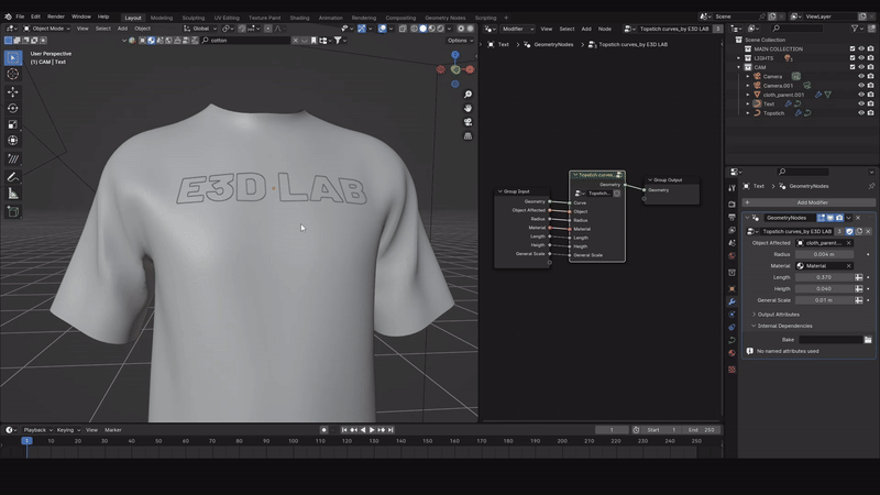 Tags: blender, blender3d, geometry nodes, procedural stitching, topstitch generator, fashion 3d, apparel cgi, garment details, clothing render, product visualization, procedural tool, free blender tool, realistic stitching, logo stitching, text stitching
